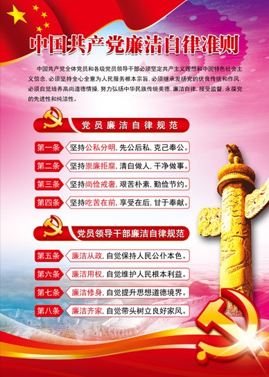 《廉洁自律准则》是2015年10月中共中央印发的《中国共产党廉洁自律准则》的简称。由党中央根据党的十八大以来全面从严治党新的实践需要,在2010年《中国共产党党员领导干部廉洁从政若干准则》基础上修订而成。全文共8条、281字,包括导语、党员廉洁自律规范和党员领导干部廉洁自律规范。其内容是: