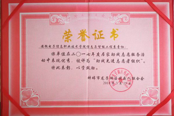 本网讯  近日传来喜讯,信息与智能工程系青年志愿者协会被蚌埠市龙子湖区残联授予“助残先进志愿者组织”,计算机应用技术专业16级志愿者陈文生同学被授予“先进个人助残志愿者”称号。