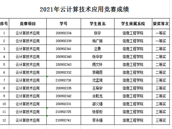 本网讯 12月18号上午,由信息工程学院举办的2021年云计算技术应用竞赛在南401教室举行。来自学院近50名同学报名参加比赛,参赛选手经过指导教师的精心指导,在紧张的比赛之后,最终,张宇、杨广振等十二名同学分别获得一、二、三等奖。
