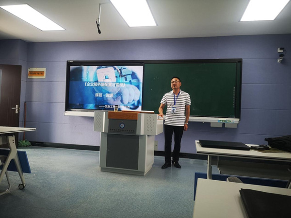 首先由信息安全教研室周丰杰老师讲授“企业服务器配置与管理”课程,他先从多个维度进行说课,再以架设校园网DNS服务器为项目开展一节课教学示范。教学过程中,周老师思路清晰,语言通俗易懂,整个过程基于课程的信息化教学平台,将课程思政“润物细无声”有机地融入到课程教学环节,体现出课前、课中、课后全程育人,课堂教学达到预期效果。