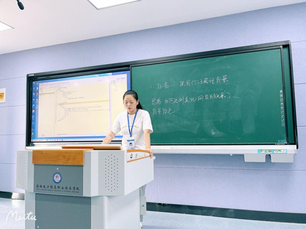 接着由Web前端开发教研室曹梦如老师讲授“Web标准网站设计”课程,她先从课程定位、教学目标、教学内容设计、教学手段、教学反思等多个维度进行了说课。课程以“全面贯彻习近平新时代中国特色社会主义思想”为文字素材,用任务驱动的方法对CSS3背景设计进行讲解,同时结合课程的信息化教学平台,发挥课堂教学主渠道作用,达到了课程育人的基本效果。