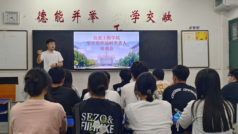 本网讯 为进一步加强学生干部的思想政治素质,提高学生干部业务水平,培养一支高素质、创造性、实干型学生干部队伍,增强学生组织的组织力、号召力,信息工程学院团委于9月19至20日晚开展了学生组织临时负责人工作能力提升培训会。本次培训会由学院团委负责人韦鹏程负责授课。