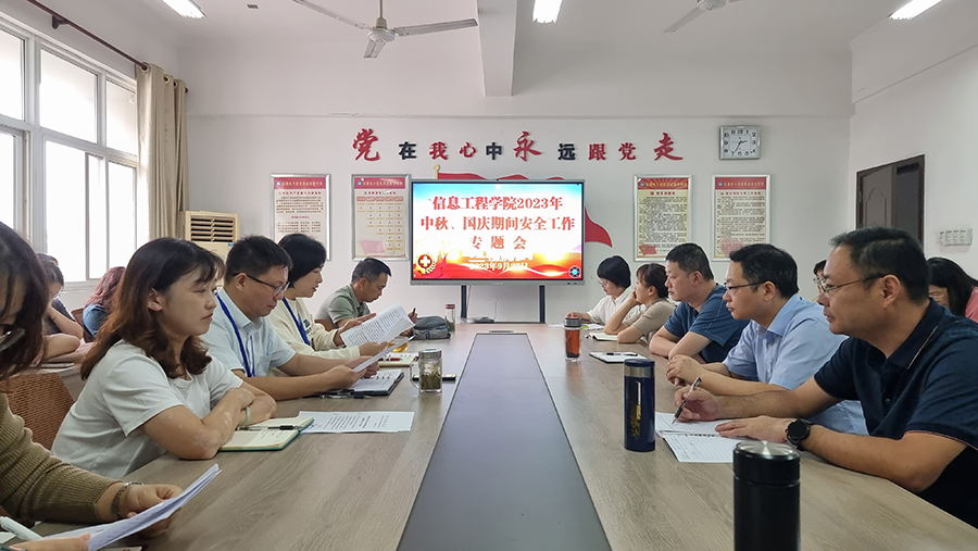 本网讯 2023年中秋、国庆“双节”假期即将来临,为进一步提高师生安全防范意识,保障师生人身财产安全,确保全体师生过上一个祥和安全的假期,结合学院安全工作会议精神,9月27日下午,信息工程学院在南306会议室召开中秋、国庆“两节”安全工作专题会,传达上级有关安全工作文件、通知和会议精神,部署安排部门假期安全管理工作。全体教职工参加了会议,会议由党总支书记、院长朱正月主持。