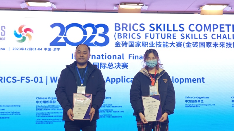 本网讯 近日,2023金砖国家职业技能大赛Web技术赛项国际总决赛在山东济宁职业技术学院成功举办,本次比赛共有来自金砖五国及巴基斯坦等10个国家的309支队伍线上线下同台竞技,我院计算机应用技术专业张雅茹同学荣获二等奖,指导老师陈键获优秀指导专家奖。
