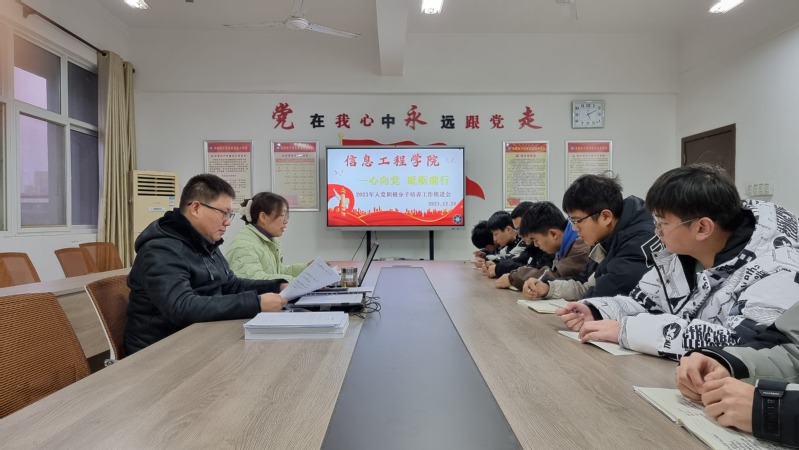 本网讯 为深入学习贯彻习近平总书记关于党的建设的重要思想、习近平新时代中国特色社会主义思想和党的二十大精神,牢牢把握立德树人的根本任务,认真做好大学生党员的发展和培养,夯实组织育人工作,12月20日下午,信息工程学院在信息中心南306会议室开展主题党日活动,召开2023年入党积极分子培养工作推进会。党总支书记、院长朱正月,学生党支部书记王大灵,党支部组织委员凡佳和28名入党积极分子参会,会议由王大灵主持。
