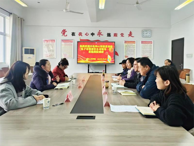 本网讯  3月6日下午,中国电科41所蚌埠依爱消防电子责任有限公司党总支书记黄薛梅、人力资源部部长林丽萍一行来信息工程学院走访交流。信息工程学院党总支书记、院长朱正月,副书记张曌,副院长胡北辰,各教研室主任以及物联网专业带头人毕好昌等参加了座谈会,同时特邀学院校企合作办主任翟文胜与会交流。座谈会在信息中心南306会议室举行。