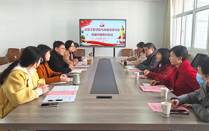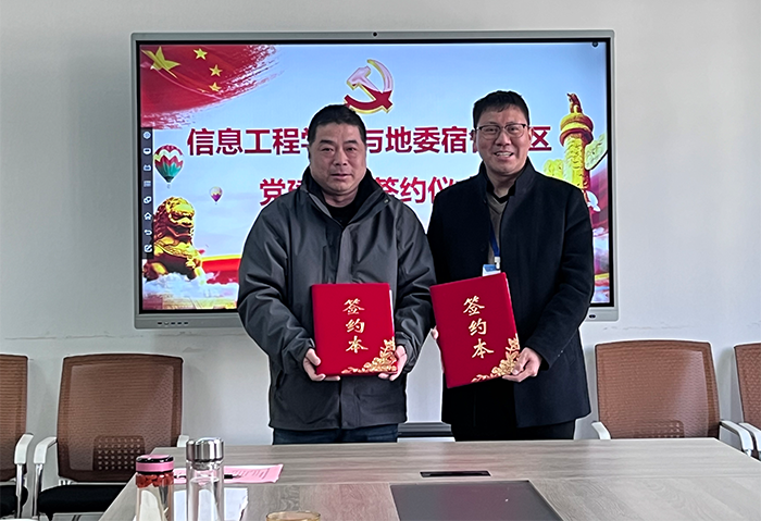 活动中,蚌埠地委宿舍社区党委书记赵琳和信息工程学院党总支书记、院长朱正月分别介绍了社区和学院的基本情况以及近年来基层党建工作开展情况,并就如何利用双方资源及优势,建立“学校+社区”校地融合的基层党建共建机制进行了深入交流。随后,校地双方签订了共建协议书,并表示将以此次签约共建活动为契机,整合双方党建资源,搭建共享平台,发挥双方党组织的战斗堡垒作用和党员的先锋模范作用,携手贯彻落实好新时代党的建设总要求,共同探索基层党建与社区服务深度融合新路径,以实现党建引领、服务民生、实践育人、文明共创、共同发展。
