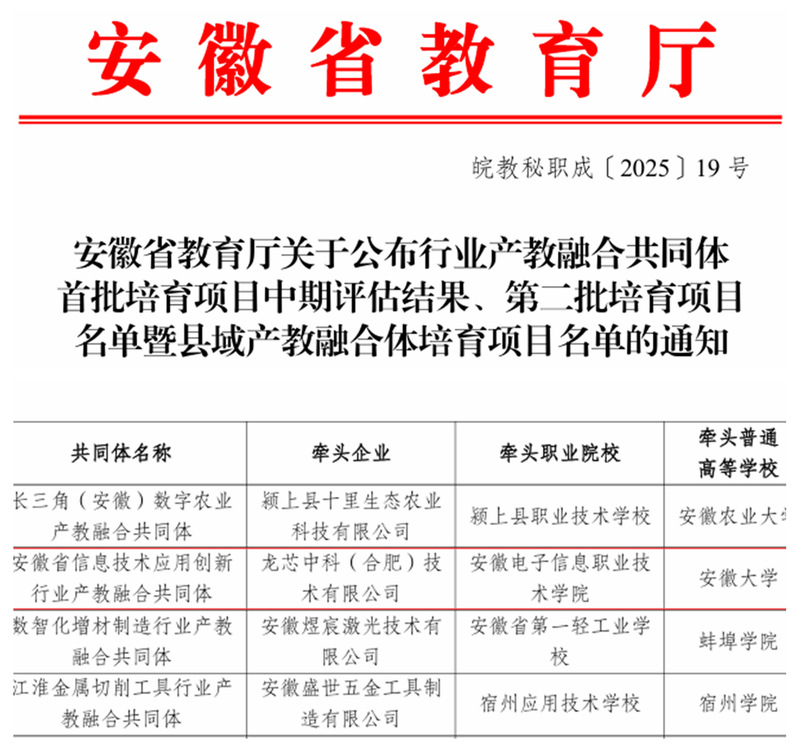 本网讯 近日,安徽省教育厅公布第二批行业产教融合共同体培育项目名单,由学院与龙芯中科(合肥)技术有限公司、安徽大学三方联合申报的安徽省信息技术应用创新行业产教融合共同体项目获省级培育立项。