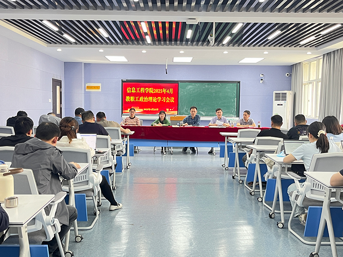 本网讯 根据《学院2025年教职工政治理论学习计划》安排,结合组织人事处《关于组织学习相关文件精神的通知》要求,4月23日下午,信息工程学院在南302室召开教职工政治理论学习会,深入学习习近平总书记关于师德师风的重要论述、全国“两会”精神和各级各类文件通知精神,全体教职工参会。学习会由院长朱正月主持。