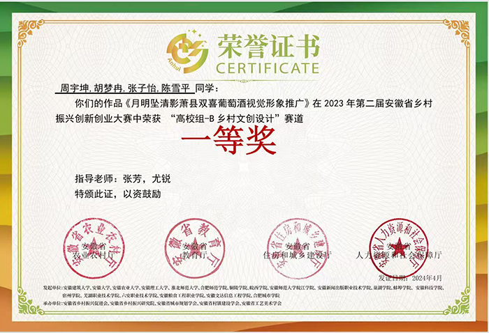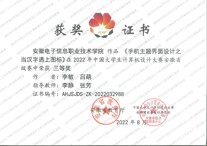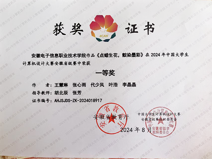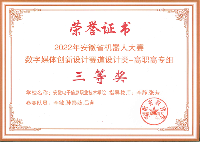 近两年学生在中国大学生计算机设计大赛、全国大学生广告艺术大赛、安徽省大学生质量文化与品牌创意设计大赛、安徽省大学生原创动漫大赛等赛事中获得佳绩,先后获得国家级二等奖1项,省级一等奖10项,省级二等奖19项,省级三等奖30余项。