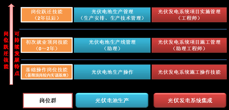 主要岗位:主要面向太阳能电池生产企业、光伏发电系统工程建设企业、中小型光伏发电运营企业的相关职业岗位。能从事现场工艺和技术管理、光伏组件生产与检测、光伏系统的单片机及PLC控制电路设计与调试、光伏电站设备的安装、使用、维护与调试、光伏产品售后技术服务等技术工作和管理工作岗位。