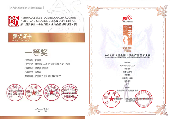 近两年学生在中国大学生计算机设计大赛、全国大学生广告艺术大赛、安徽省大学生质量文化与品牌创意设计大赛、安徽省大学生原创动漫大赛等赛事中获得佳绩,先后获得省级一等奖3项、省级二等奖9项、省级三等奖16项。