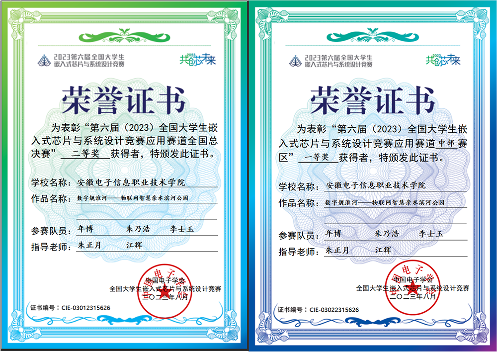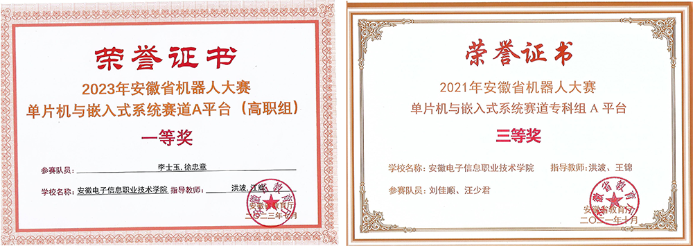 2 | 2023 | 安徽省高校物联网应用创新大赛创意赛一等奖1项、、三等奖3项 安徽省高校物联网应用创新大赛竞技赛智能搬运三等奖1项 安徽省职业院校技能大赛物联网技术应用赛项三等奖1项 全国大学生嵌入式芯片与系统设计竞赛应用赛道全国总决赛二等奖1项 全国大学生嵌入式芯片与系统设计竞赛应用赛道中部赛区一等奖1项 安徽省机器人大赛单片机与嵌入式系统赛道A平台一等奖1项 安徽省机器人大赛单片机与嵌入式系统赛道D平台三等等奖1项 |
