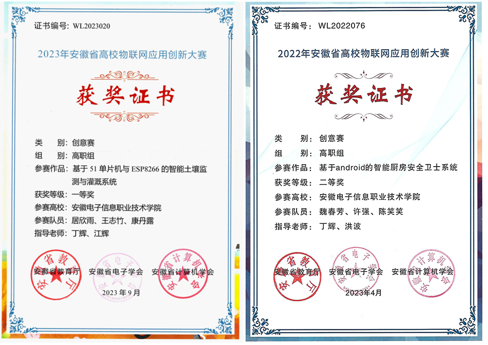 3 | 2022 | 安徽省职业院校技能大赛物联网技术应用赛项三等奖1项 安徽省高校物联网应用创新大赛创意赛二等奖1项、三等奖1项 安徽省机器人大赛单片机与嵌入式系统赛道A平台二等奖1项 |