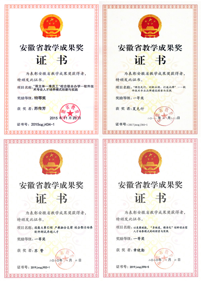 专业师资力量雄厚,先后建成省级软件技术优秀教学团队、省级教师教学创新团队和安徽省高等学校省级示范基层教研室。团队有国家级名师1名,安徽省教学名师2名、安徽省优秀教师1名、安徽省课程思政教学名师1名、安徽省教坛新秀3名、全国职业技能大赛优秀指导教师2名。