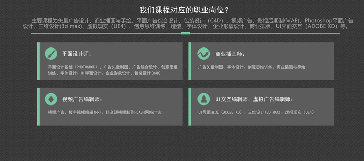 掌握各类广告设计的基本理论,基本操作技术、以及广告创意思维的发散设计理念,能够面向各类中小微企业,从事平面广告、视频广告、虚拟交互广告的设计与制作工作岗位的高素质技术技能人才。