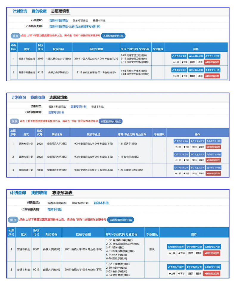 从上面三张图可以看出,这名考生填报了本科提前批次公安类2所院校专业组,国家专项批次报考了3个院校专业组(均为安徽师范大学),普通本科提前批报考了2个院校专业组,每个批次每个专业组填报了数量不等的专业志愿。