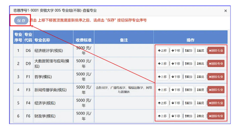 在弹出的窗口中,点击“上移”“下移”“置顶”或“置底”来改变专业志愿的顺序,也可以删除专业志愿,特别注意,调整完成后必须点击“保存”,否则操作无效!!