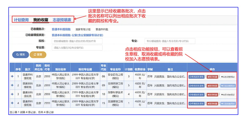 上图表示,考生已经将4个专业加入了“我的收藏”,已经直接将3个专业加入了“志愿预填表”。用同样的方法,查询、填报国家专项计划和普通本科院校志愿。