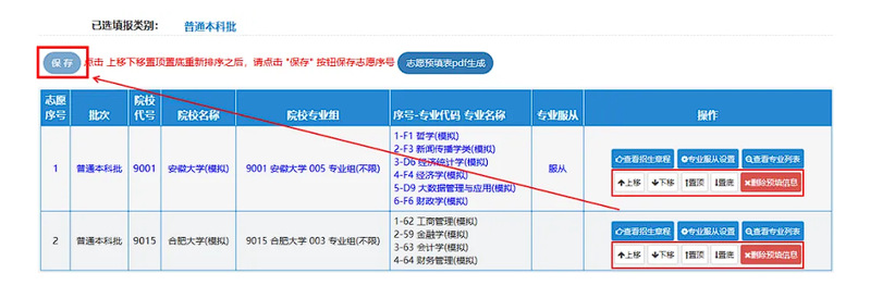 以该考生填报的普通本科批志愿为例,目前该考生填报了2所院校,依序分别为:安徽大学、合肥大学,如果需要调整院校志愿顺序,请点击“操作”中的“上移”“下移”“置顶”或“置底”来改变院校志愿的顺序,也可以删除院校志愿。调整完成后同样必须点击“保存”,否则操作无效!!