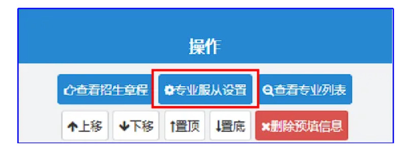 从上面的图中可以看出,“专业服从”栏内为空,在正式志愿填报时,“专业服从”栏必须填写(除不设专业服从志愿的类型外),点击“专业服从设置”: