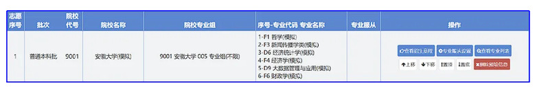 以上图中考生填报的普通本科批安徽大学志愿为例,上图中,考生填报的6个专业志愿按序分别为:D6、D9、F1、F3、F4和F6,如果要调整专业志愿的顺序,请点击“查看专业列表”: